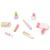 The set includes a stylish cosmetic table, a matching chair, a large mirror and a spacious drawer, a wooden makeup palette with a brush, wooden lipstick, wooden nail polish, a pink perfume bottle, a hair comb, a powder brush, a hair dryer and a curling iron.